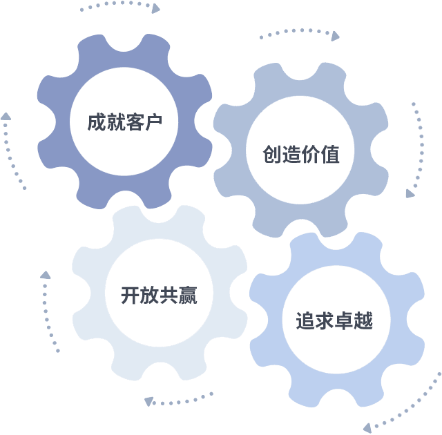 成就客户是一切决策的出发点,,,创造价值是衡量所有工作的标准,,,,追求卓越是我们做事做人的态度,,开放共赢是我们的格局也是最终的结果。。。价值观的齿轮环环相扣,,,推动着组织里的每个人不断向前。。。。